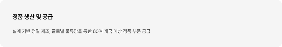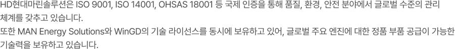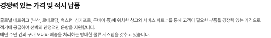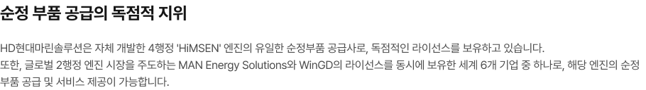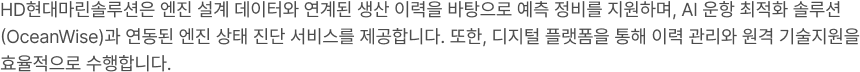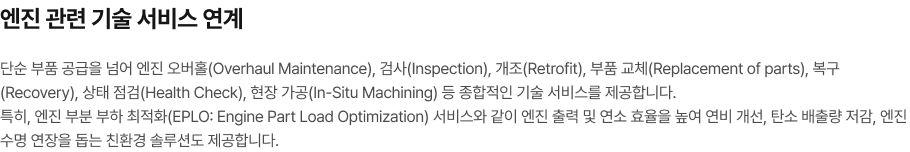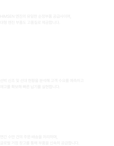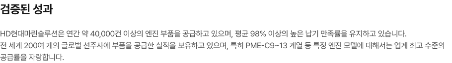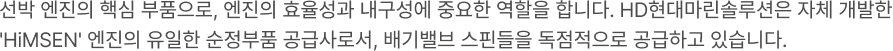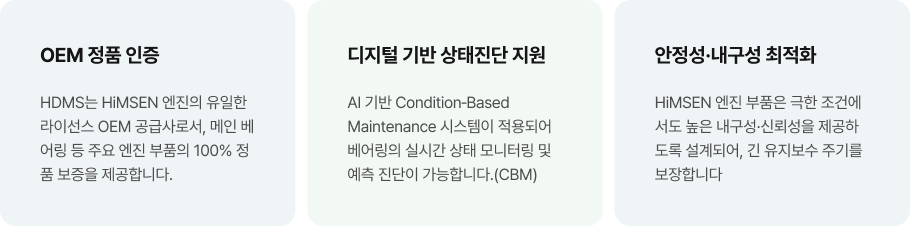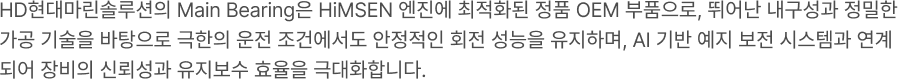 대형 선박의 운항 안정성과 연비 효율성은 고성능 엔진과 그 핵심 부품의 품질에 달려 있습니다. HD현대마린솔루션은 HD현대중공업의 설계/제조 노하우를 바탕으로 한 정품 대형 엔진 부품을 공급하며, 최고 수준의 정밀도, 내구성, 부품 호환성을 보장합니다.